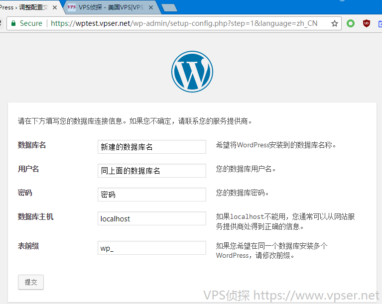 如果按前面"虚拟主机添加教程"创建的数据库,数据库名和用户名相同,密码为你设置的。另外两项数据库主机和表前缀保持默认就可以。