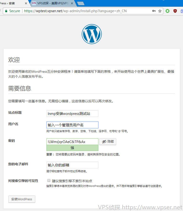 填写你的邮箱就可以了,最后确认信息没错后点击"安装wordpress"。